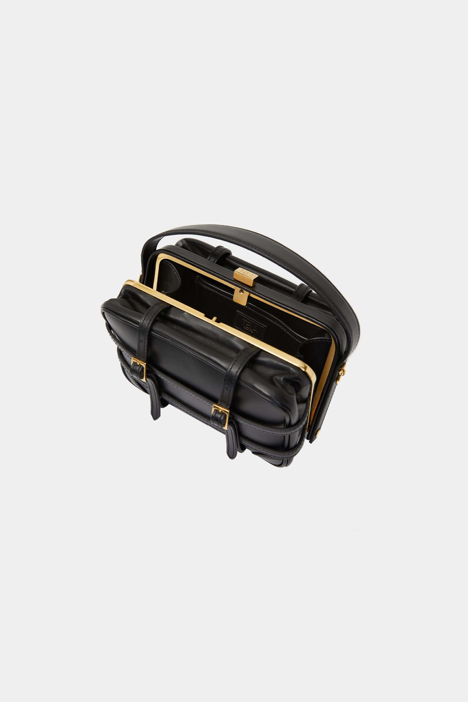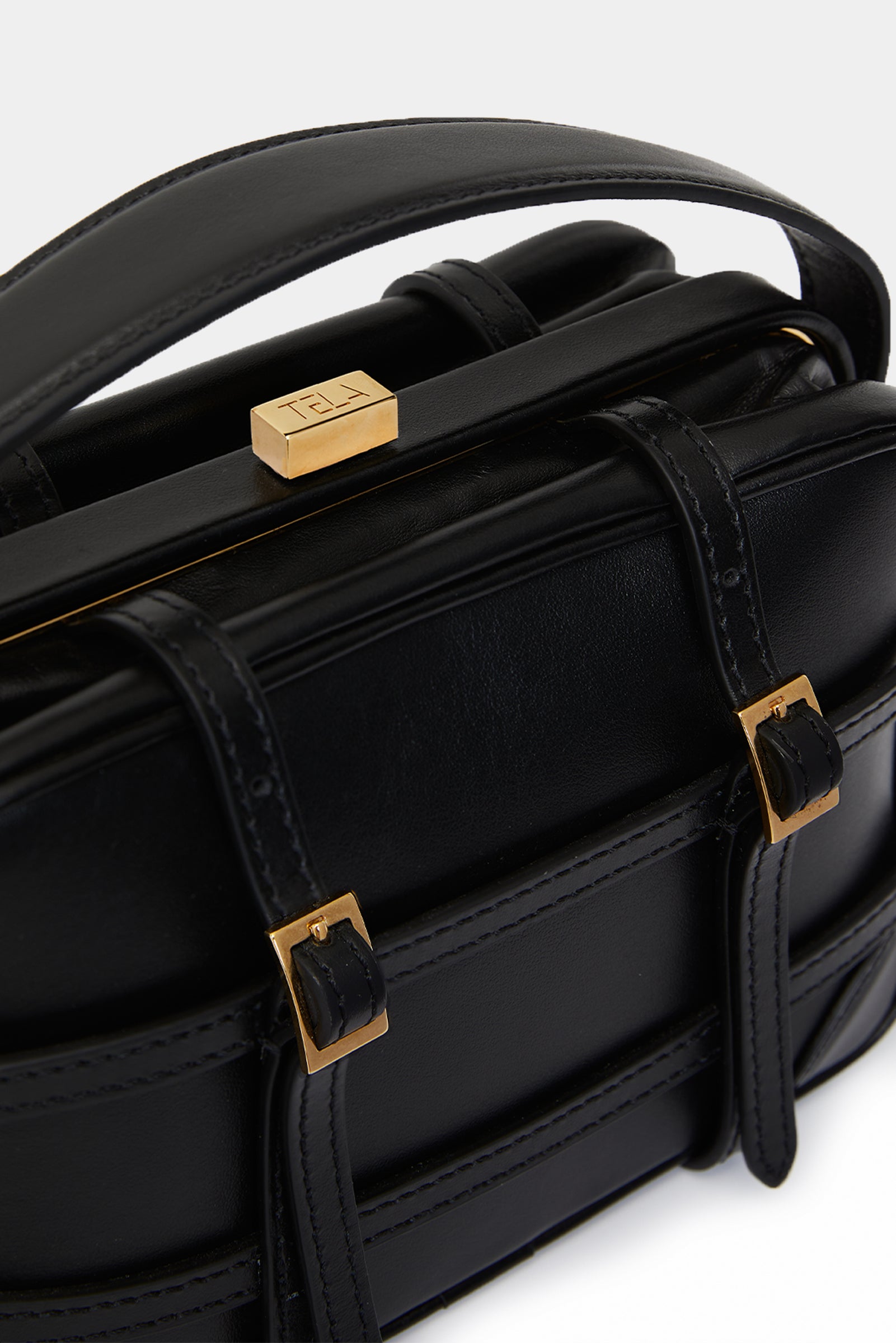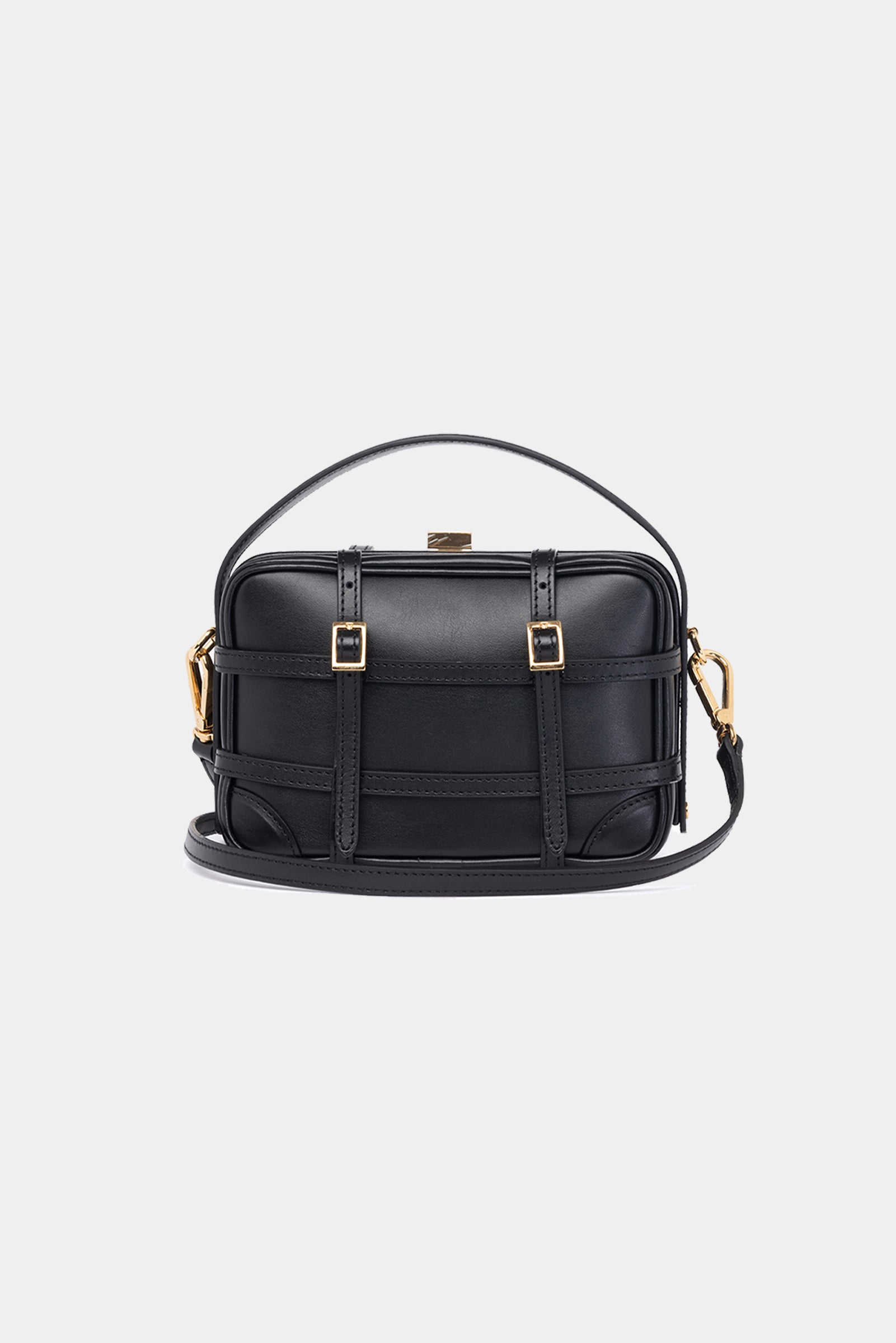 Leather bag with intersected string motif, with removable shoulder belt and small inside pocket.